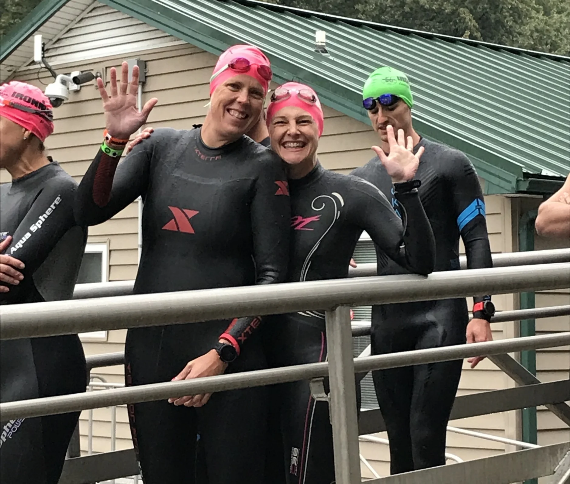 Once at the swim start, we lined up according to our expected swim time. Natalee and I got in the 1:20 – 1:30 line. We made friends with the people around us and were joined by more of our Tri-family who made the wait fun and kept our mind off what was about to happen. At 7:30, we learned by way of the telephone game that the swim had been shortened and would start ½ hour later. We sent Liz to confirm what we were hearing. It was confirmed. We digested the news and I have to admit that I was relieved because the day before during the practice swim, I encountered a very strong current that kept me in the same spot for what felt like forever. This had me a little freaked out but I had confidence in my swim ability. My coach, John, found us and gave us a little pep talk. It was good to see his calm instead of our nervous energy. At 8 we heard the pro men cannon go off and then the pro women and finally the age groupers. It would be what felt like forever before we began to move.